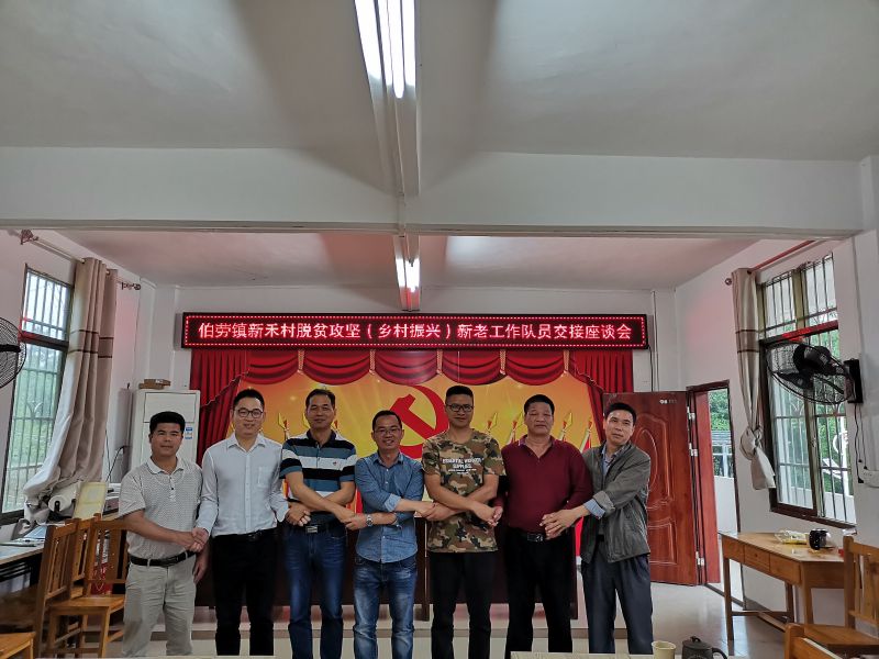 二、2021年4月26日,集團公司與市檔案館、市林科所、伯勞鎮黨委主要領導和新派駐工作隊員一同抵達靈山縣伯勞鎮新禾村,召開了伯勞鎮新禾村脫貧攻堅(鄉村振興)新老工作隊員交接座談會。座談會上,參會領導與新老工作隊員敞開心扉暢談,全面了解工作隊員近期工作情況、思想動態、遇到的困難等。參會領導對老一屆工作隊員在脫貧攻堅期間所取得的成績給予高度評價和認可,并對新一屆工作隊員提出具體要求和希望。要求老隊員站好最后一班崗,做好傳幫帶工作,新隊員要不畏艱苦,團結村“兩委”,在鄉村振興工作中奮勇爭先。座談會結束后,舉行了贈送錦旗儀式。
