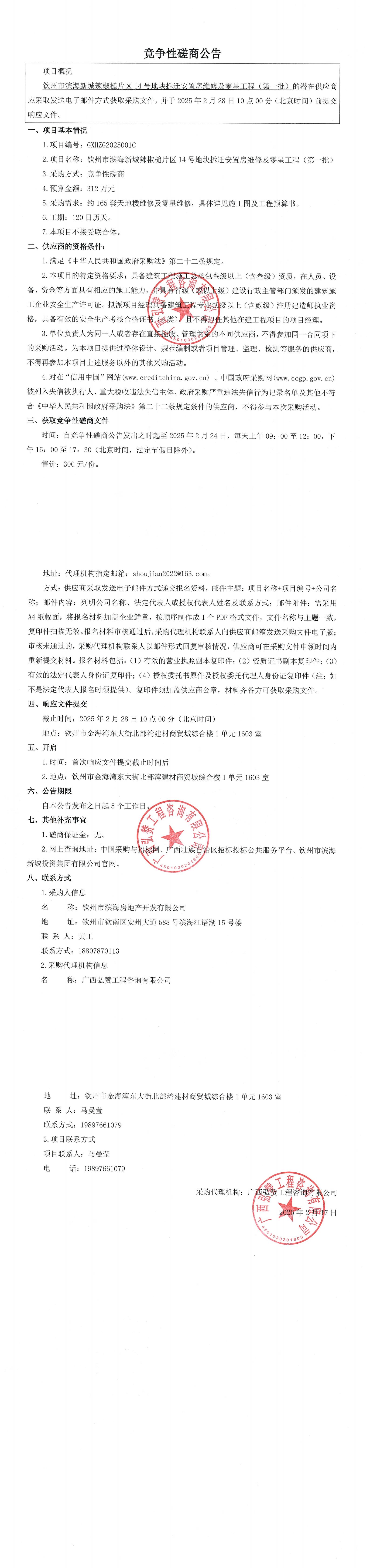欽州市濱海新城辣椒槌片區(qū)14號(hào)地塊折遷安置房維修及零星工程(第一批)競(jìng)...