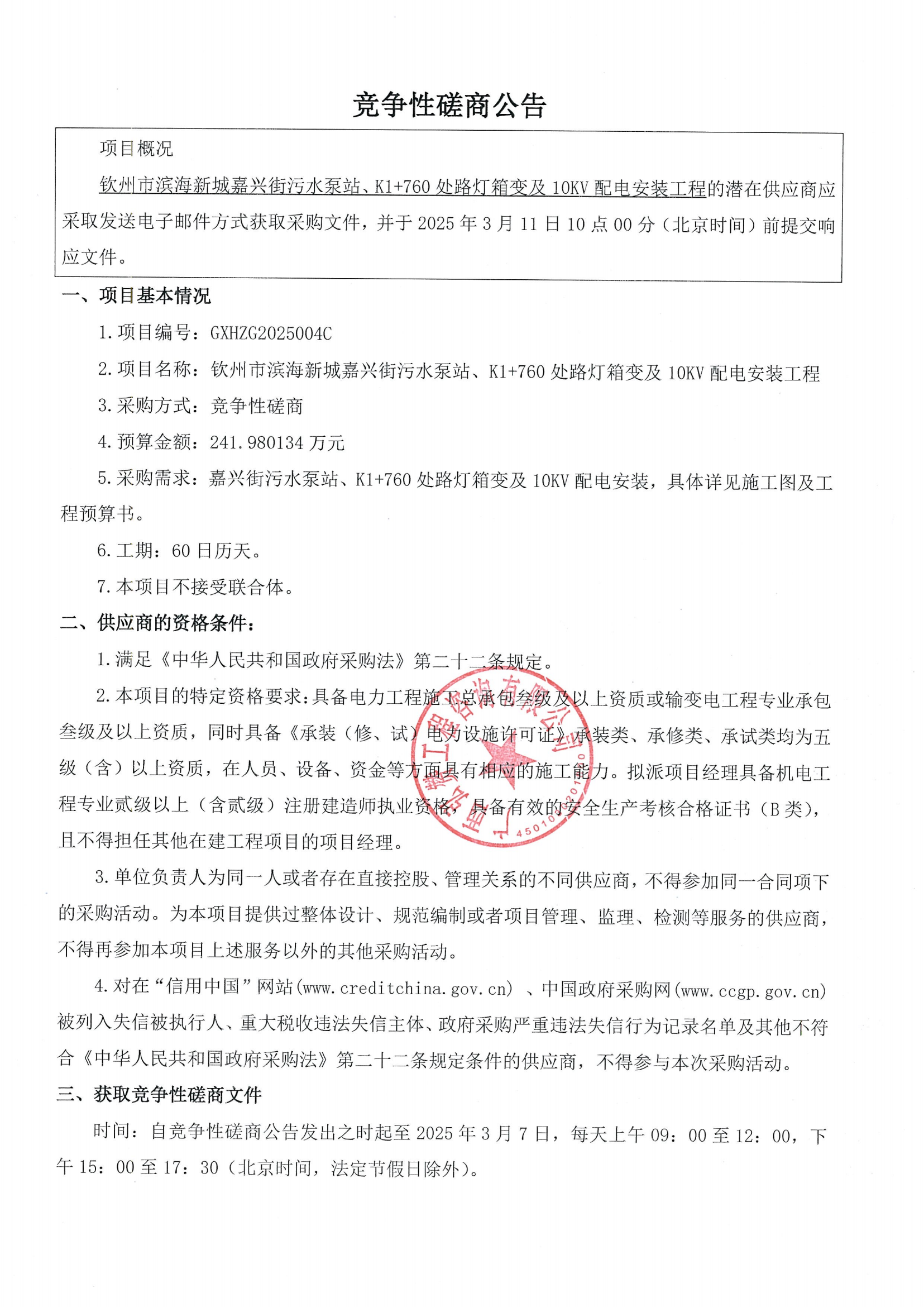 成交公告-欽州市濱海新城嘉興街污水泵站、K1+760處路燈箱變及10K...