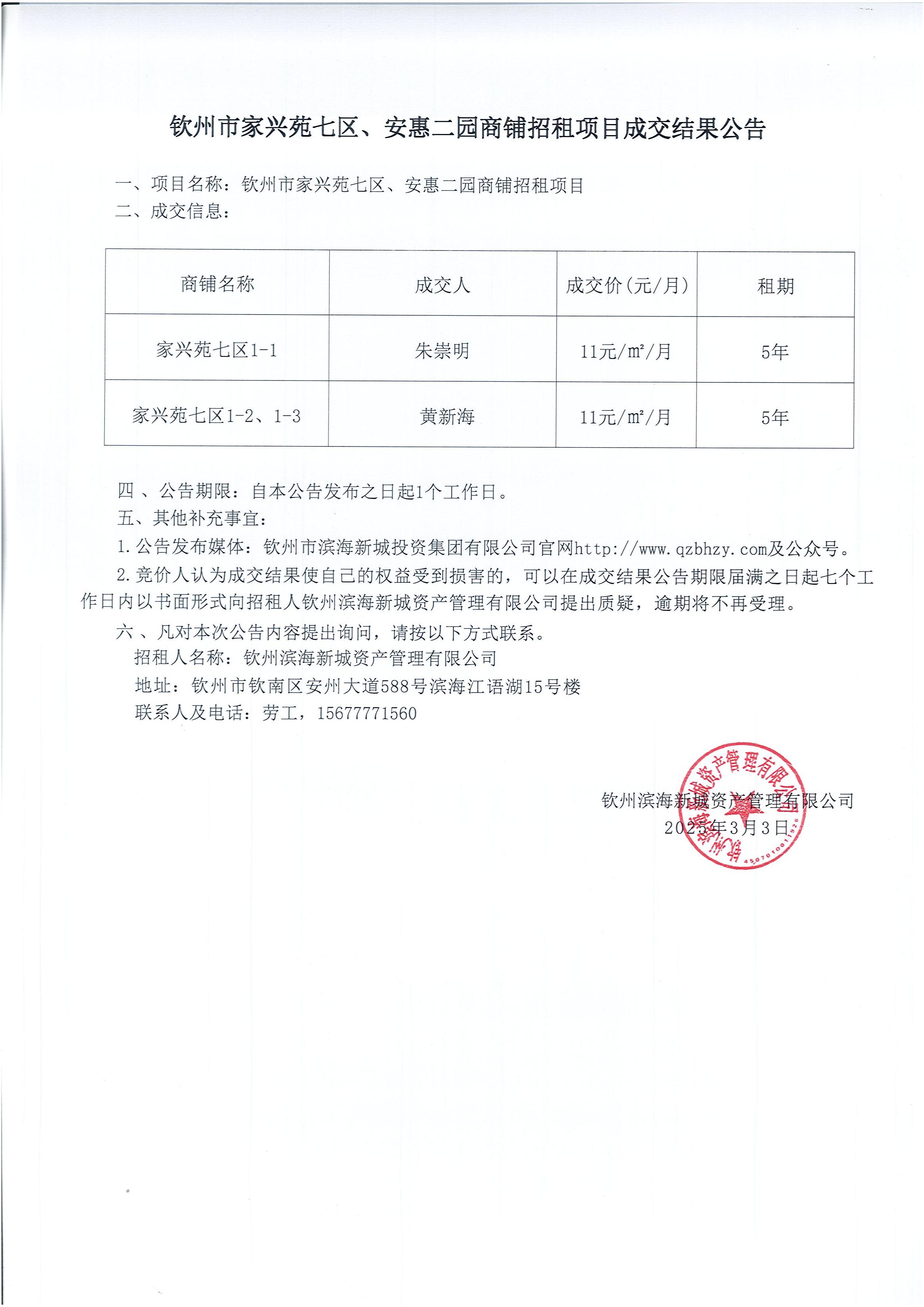 欽州市家興苑七區(qū)、安惠二園商鋪招租項(xiàng)目成交結(jié)果公告