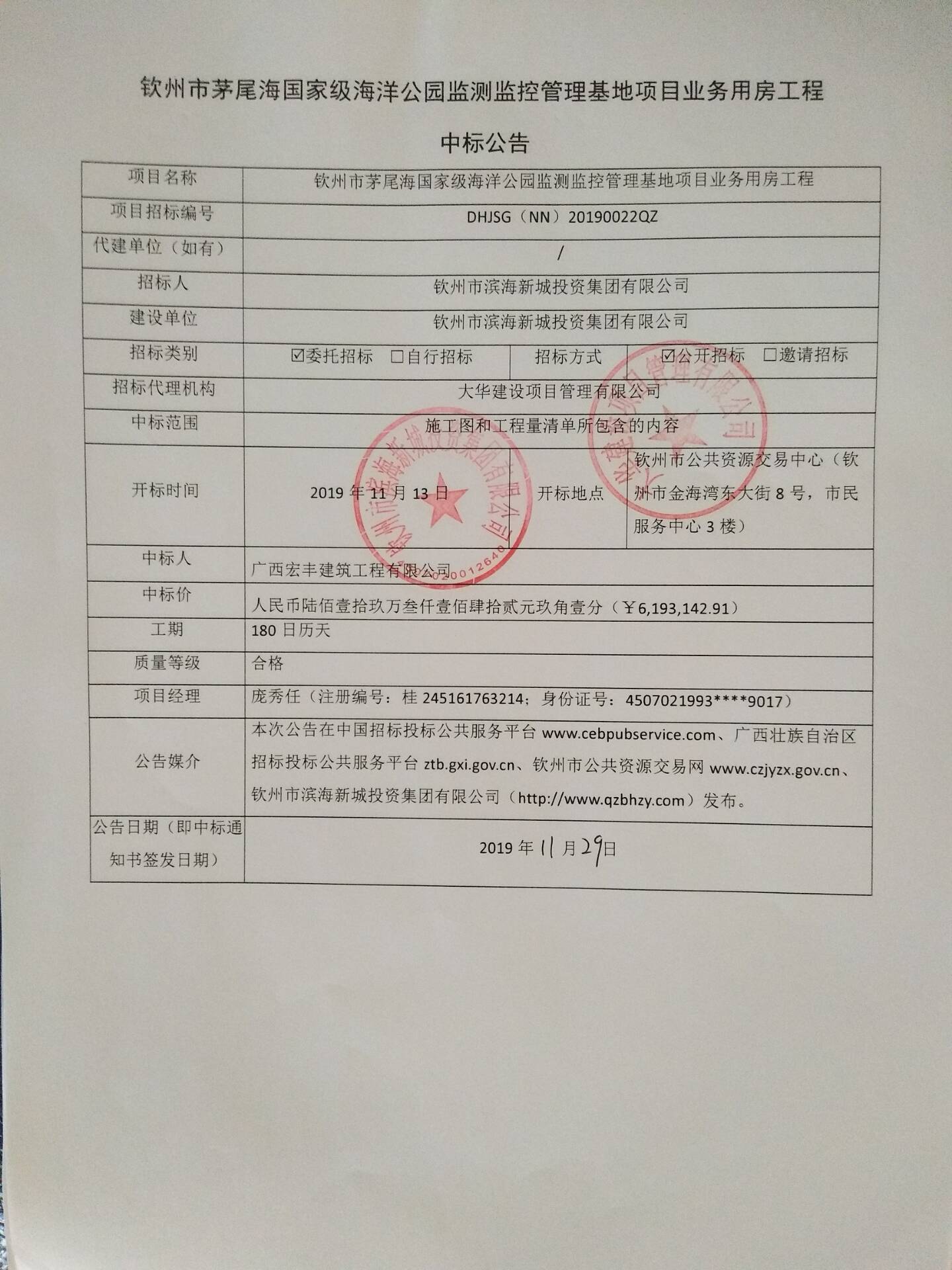 欽州市茅尾海國家級海洋公園監(jiān)測監(jiān)控管理基地項目業(yè)務用房工程-中標公告