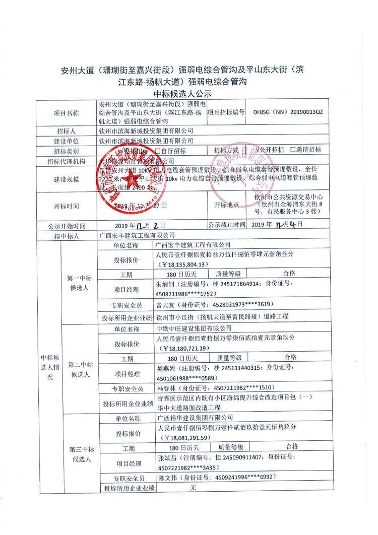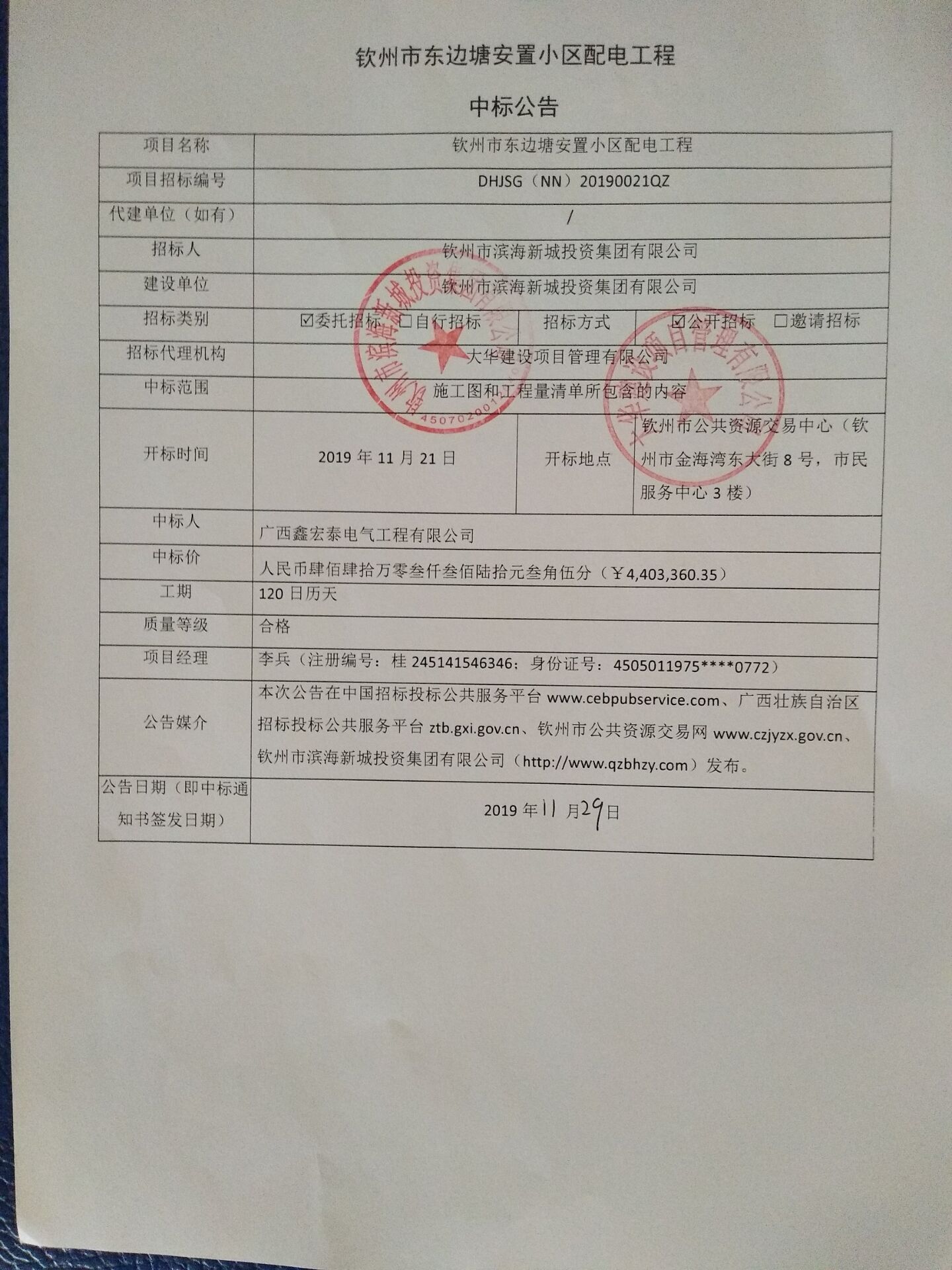欽州市東邊塘安置小區(qū)配電工程中標候選人公示
