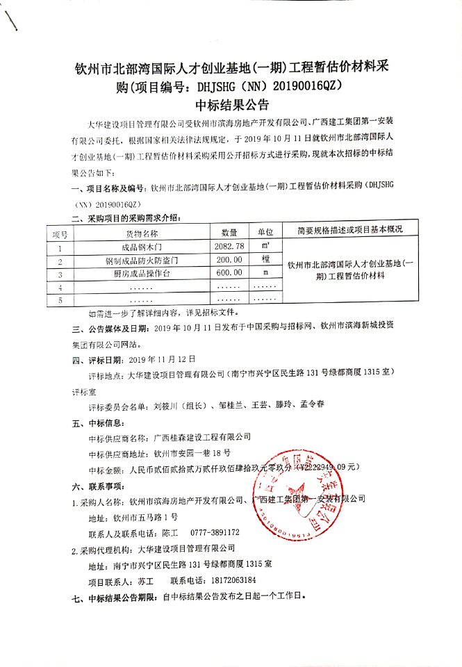 欽州市北部灣國際人才創(chuàng)業(yè)基地(一期)工程暫估價材料采購-中標結(jié)果公告