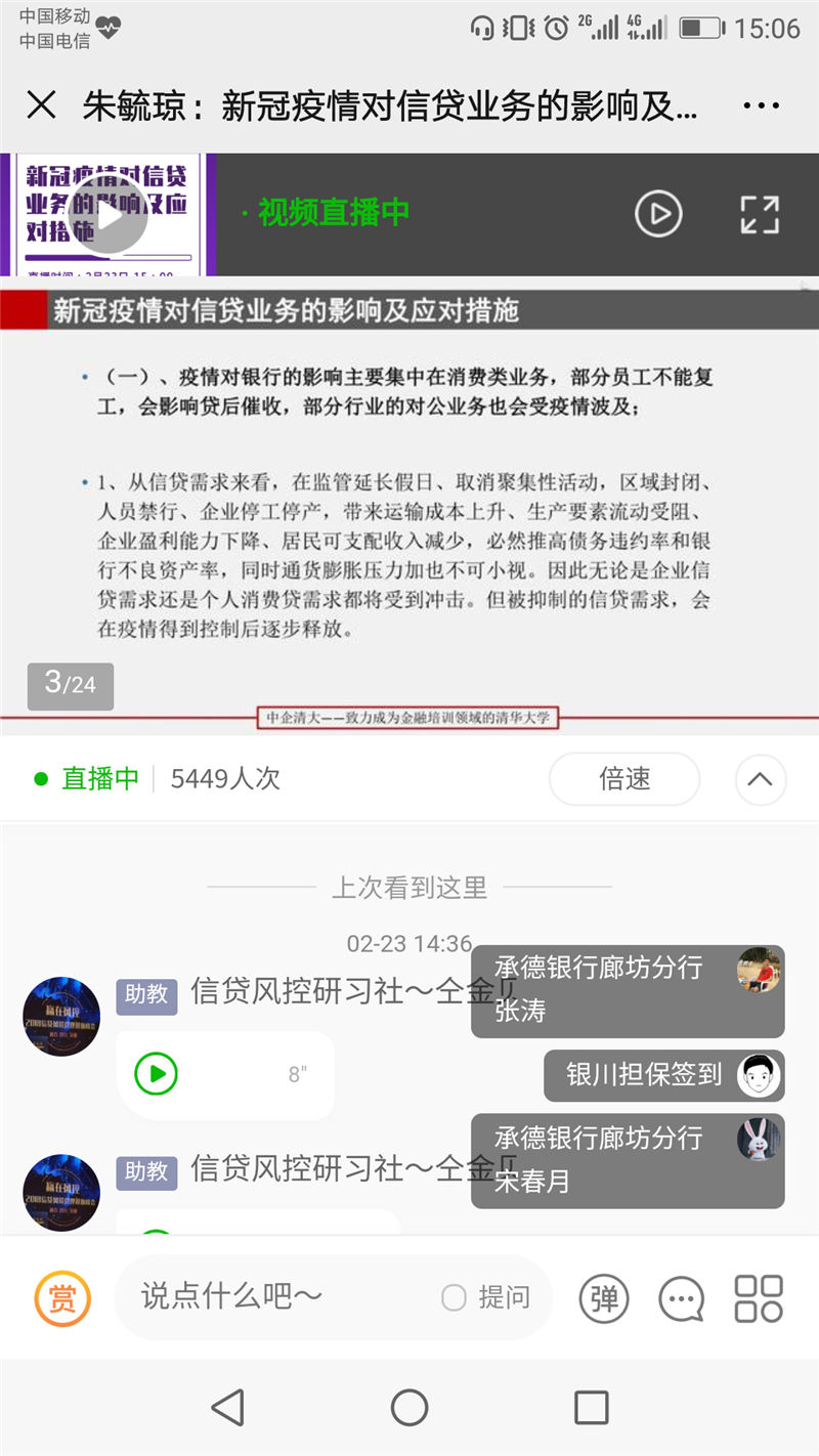 2020年2月23日下午,我公司員工集體參加銀行信貸風險專家朱毓瓊老師主講的“新冠疫情對信貸業務的影響及應對措施”專題網課。通過本次網課培訓,系統地學習了解新冠疫情對融資擔保行業的影響,充分認識本次新型冠狀病毒肺炎疫情對融資擔保行業的影響和沖擊,以及學習各地監管部門的最新政策和應對措施。