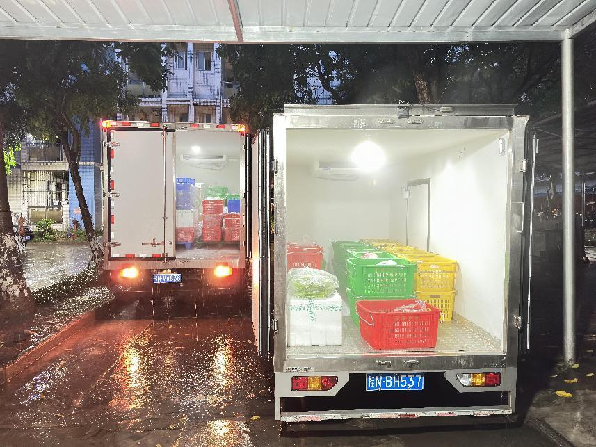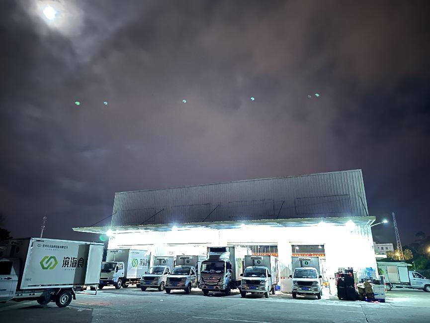 圖為凌晨兩點,濱海食材公共配送中心的倉庫燈火通明,冷鏈車整裝待發(fā)