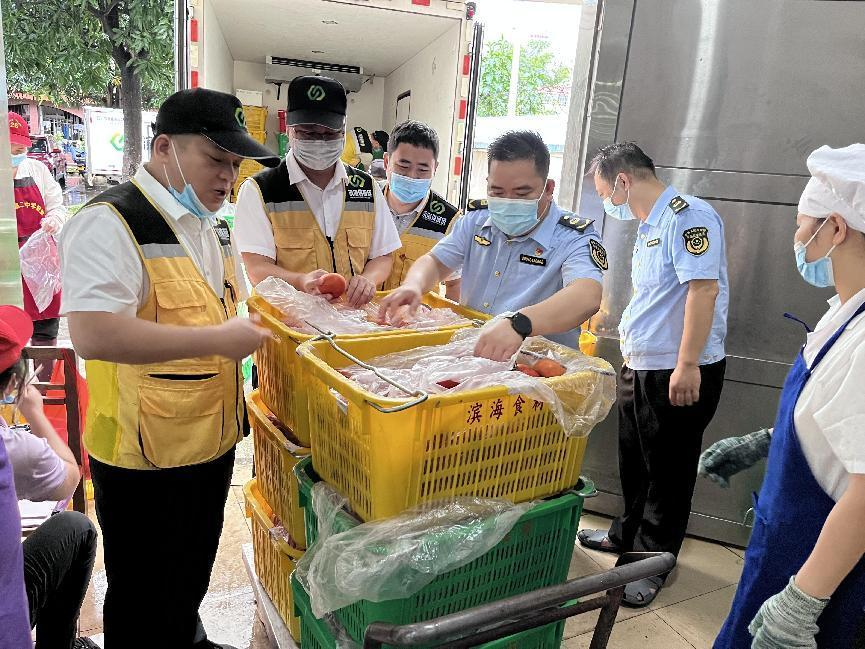 在保供工作進行中,濱海供應(yīng)鏈公司始終堅持做到:一、主動接受行業(yè)主管部門的檢查,積極與市直和南北區(qū)市場監(jiān)管部門保持溝通,按要求做好質(zhì)量把控、索證索票、留樣檢測等工作;二、從“食材安全衛(wèi)生、配送安全準時”為理念,以“五保障”協(xié)議做抓手,工作人員前置農(nóng)產(chǎn)品基地和源頭供應(yīng)商,確保食材質(zhì)量;三、安排食材檢測員貫徹落實索證索票工作,嚴格開展檢測工作,杜絕三無、有毒有害、過期變質(zhì)等不良品外流,對配送的食材共開展了306批次食材快檢,確保合格率達到100%;四、以黨建促業(yè)務(wù),充分發(fā)揮黨支部戰(zhàn)斗堡壘作用,以黨員先鋒隊作為主力軍前置各考點,確保食材保質(zhì)保量以及準時到校,并配合食材檢查和驗收工作;五、充分利用食安平臺明廚亮灶系統(tǒng),有力監(jiān)控跟蹤保障食材安全配送,同時強調(diào)產(chǎn)品溯源,加強校企聯(lián)動,做好應(yīng)急準備。