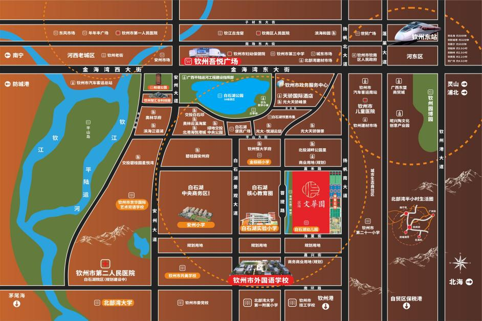 濱海·文華園項目地處白石湖商務區核心地段,位于白石湖公園、吾悅廣場、市政服務中心半小時生活圈,交通路網四通八達,各類城市配套完善,距離欽州東站、園博園較近。