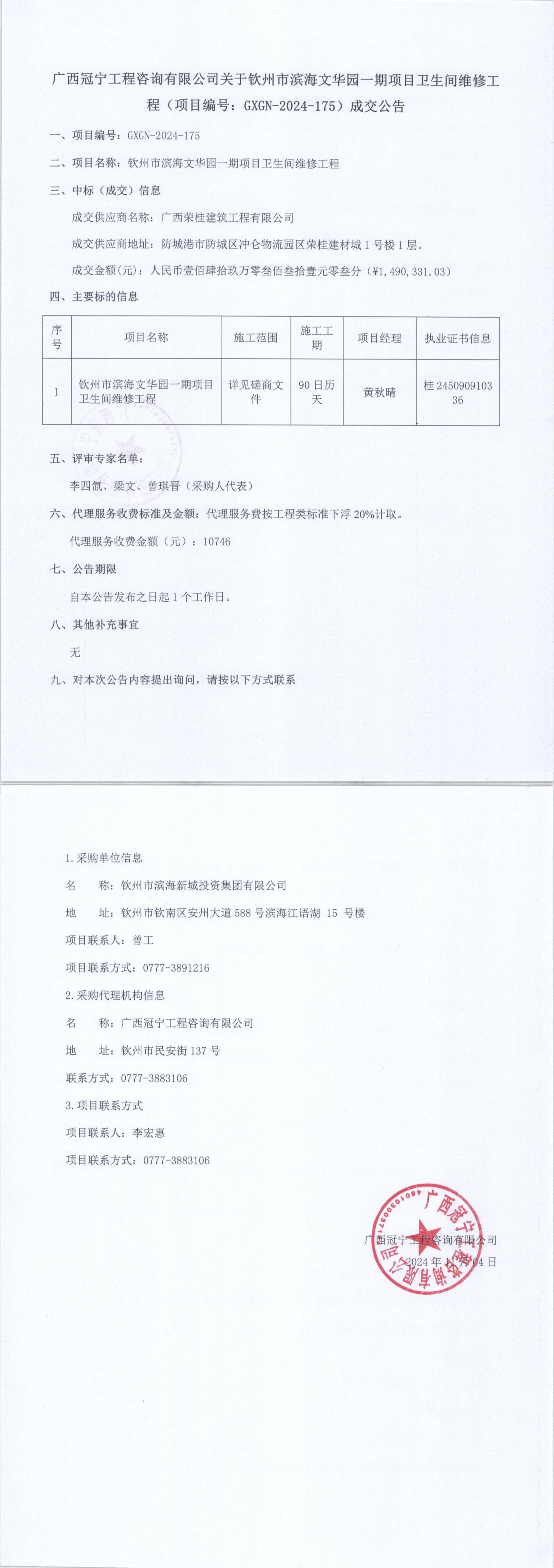 廣西冠寧工程咨詢有限公司關于欽州市濱海文華園一期項目衛生間維修工程(項...