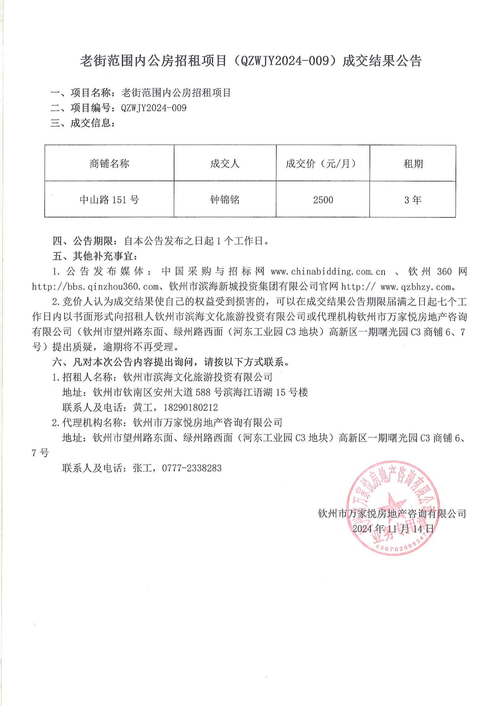 老街范圍內公房招租項目(QZWJY2024-009)成交結果公告