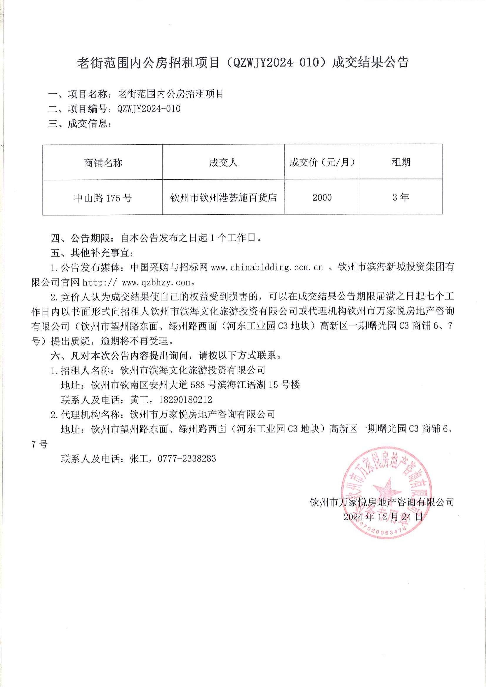 老街范圍內公房招租項目(QZWJY2024-010)成交結果公告