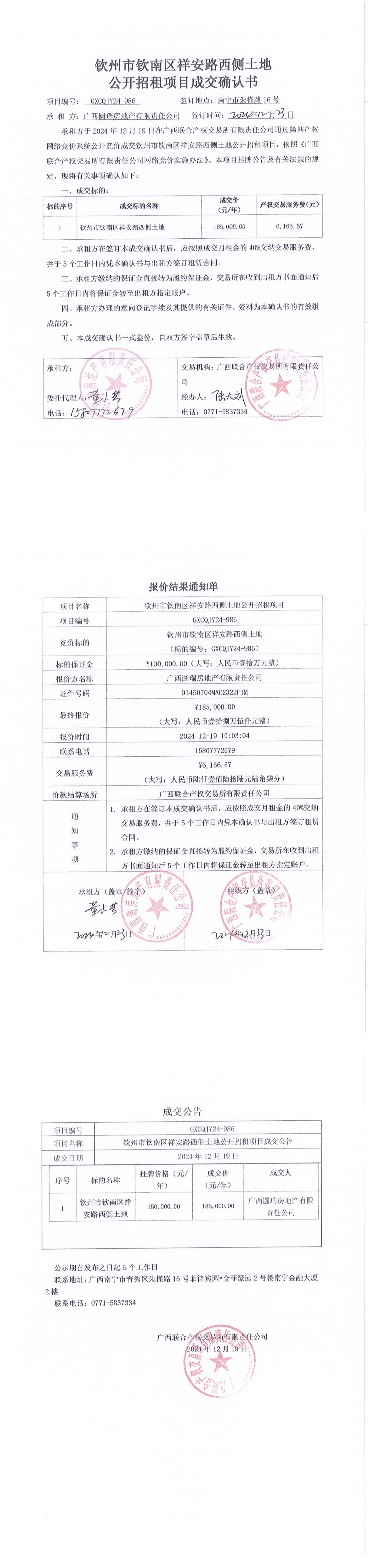 欽州市欽南區祥安路西側土地公開招租項目成交確認書