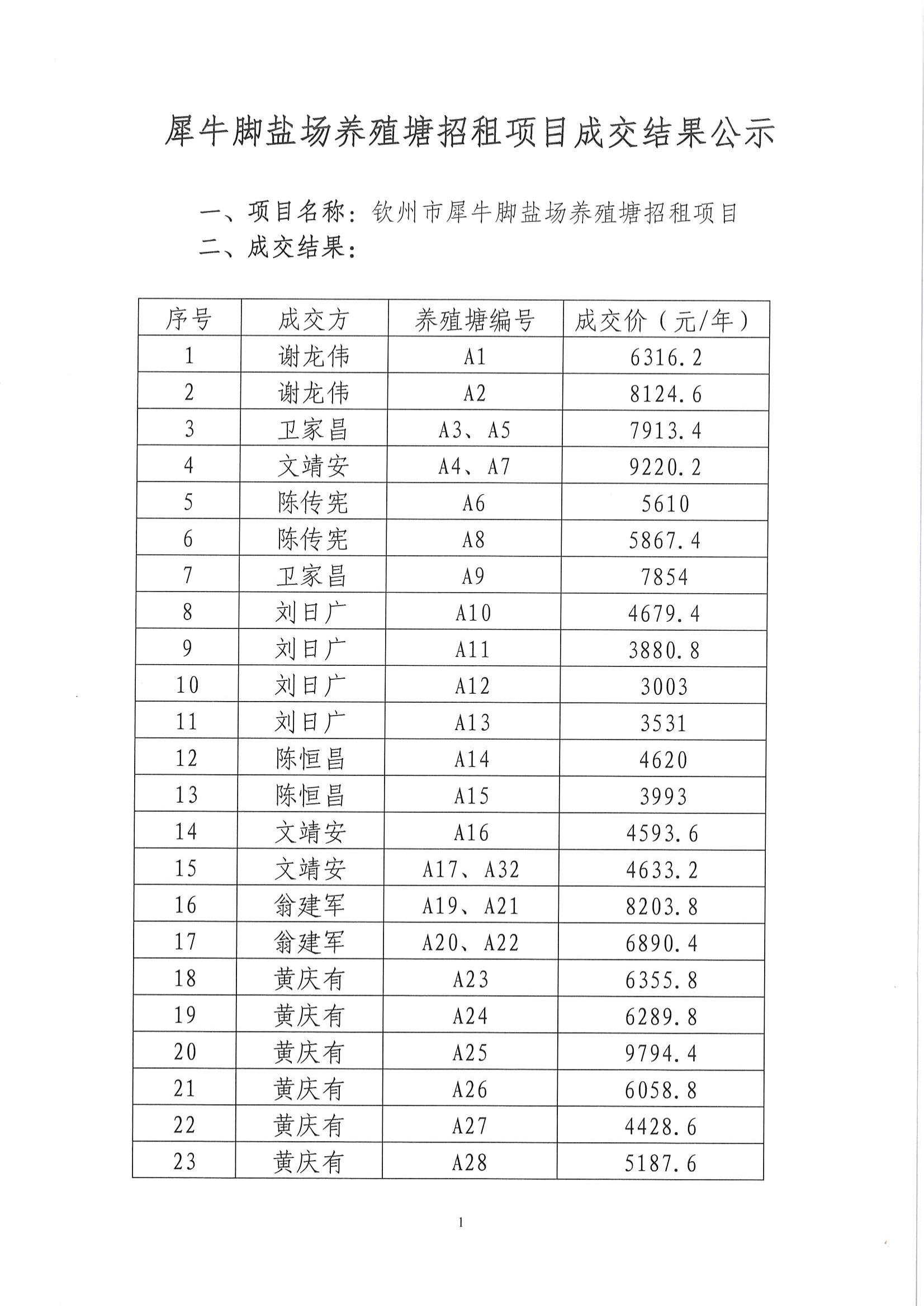 犀牛腳鹽場養殖塘招租項目成交結果公示
