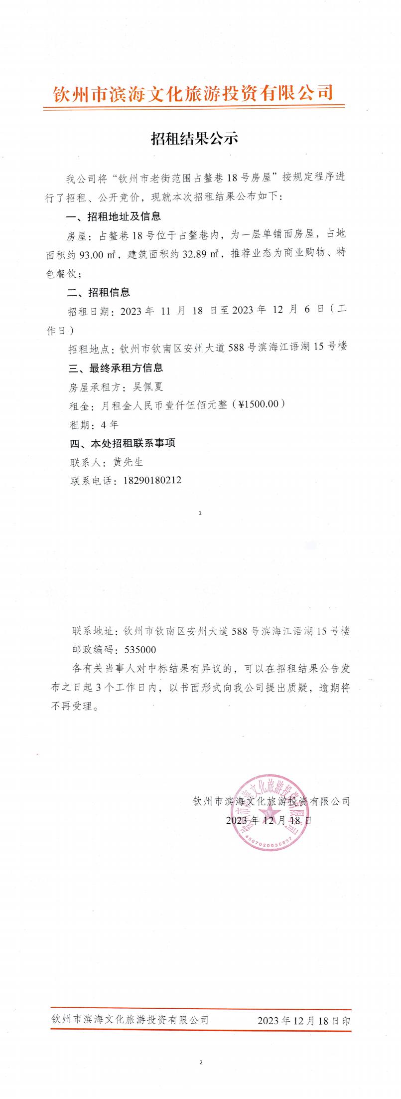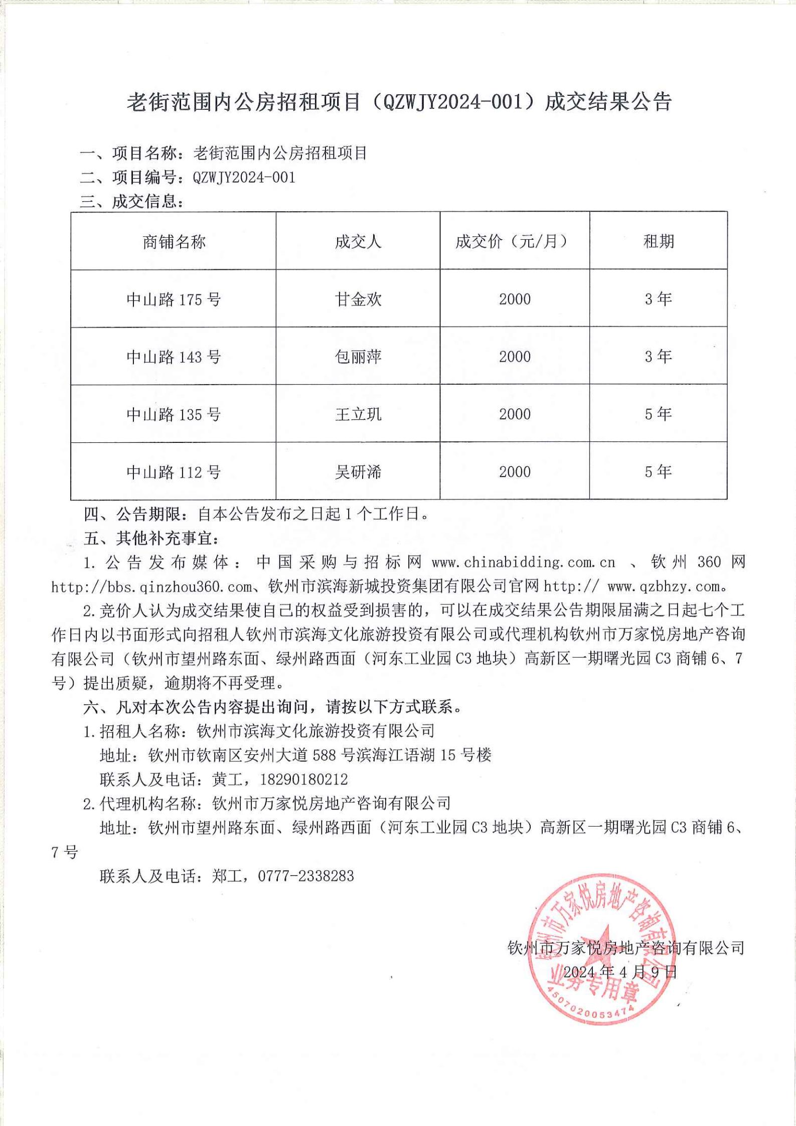 老街范圍內公房招租項目(QZKR2024-001)成交結果公告