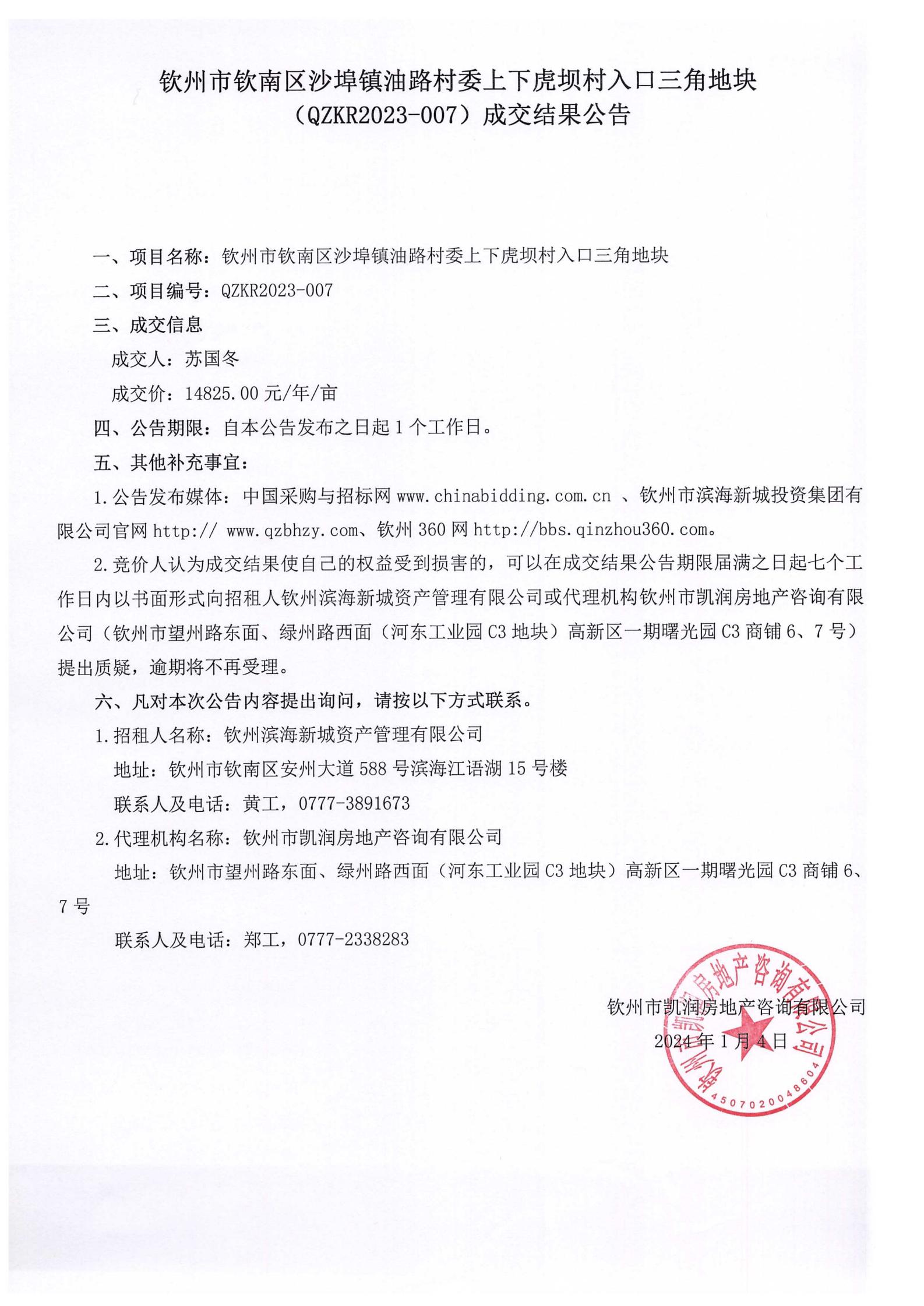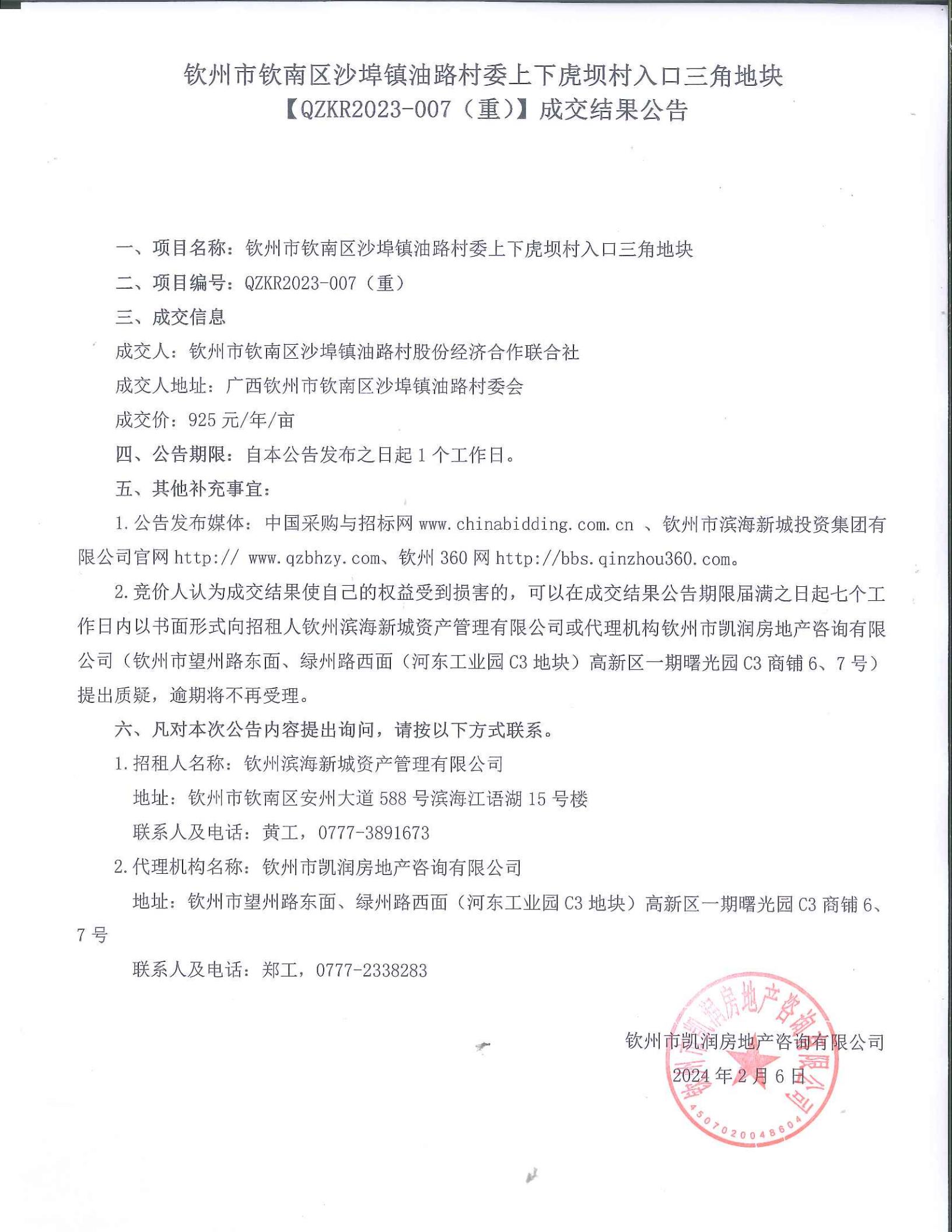 欽州市欽南區沙埠鎮油路村委上下虎壩村入口三角地塊成交結果公告