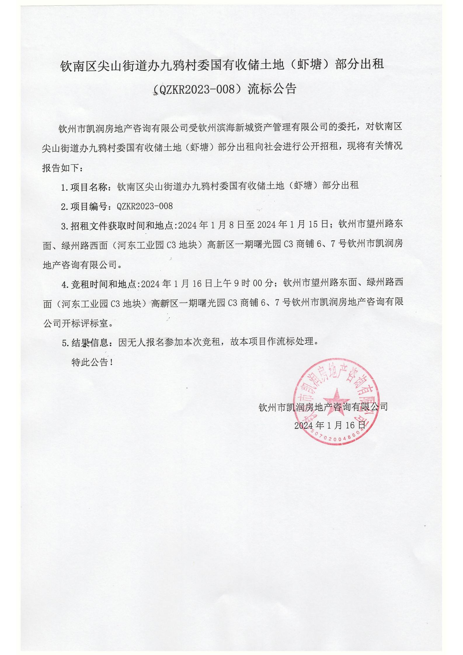 欽南區尖山街道辦九鴉村委國有收儲土地(蝦塘)部分出租(QZKR2023...