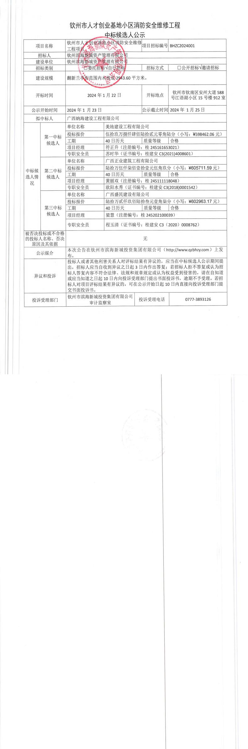 欽州市人才創業基地小區消防安全維修工程中標候選人公示