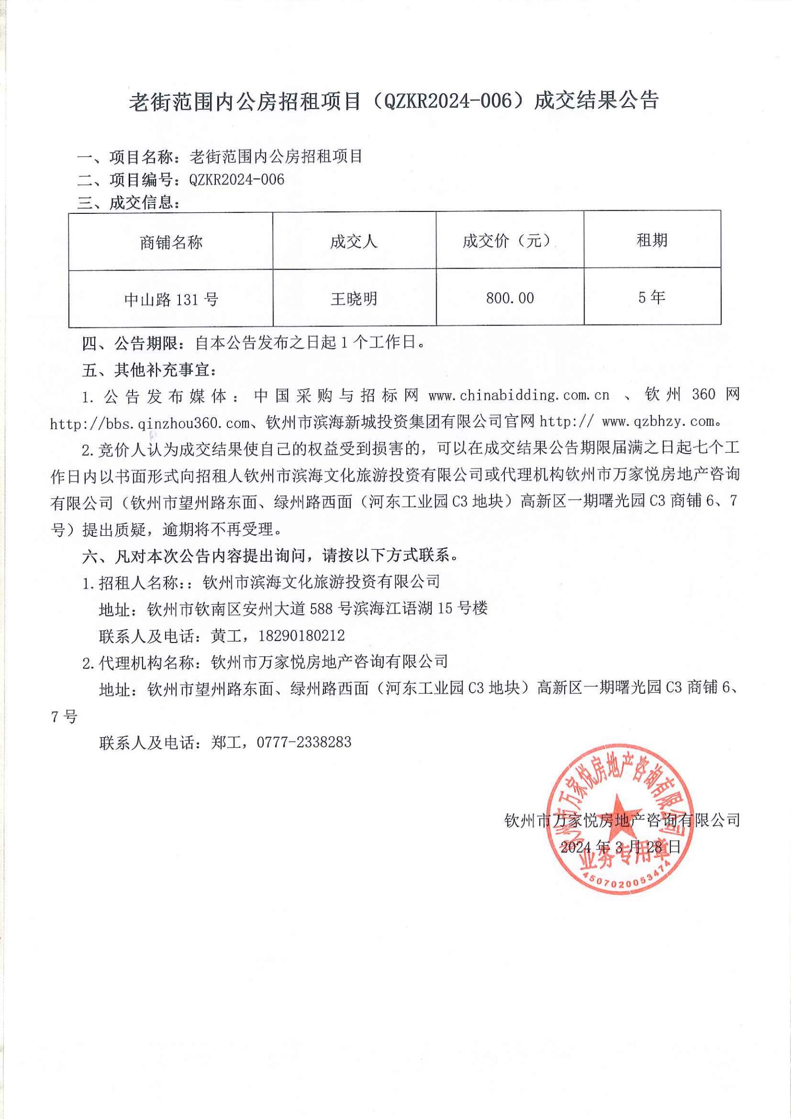 老街范圍內公房招租項目(QZKR2024-006)成交結果公告