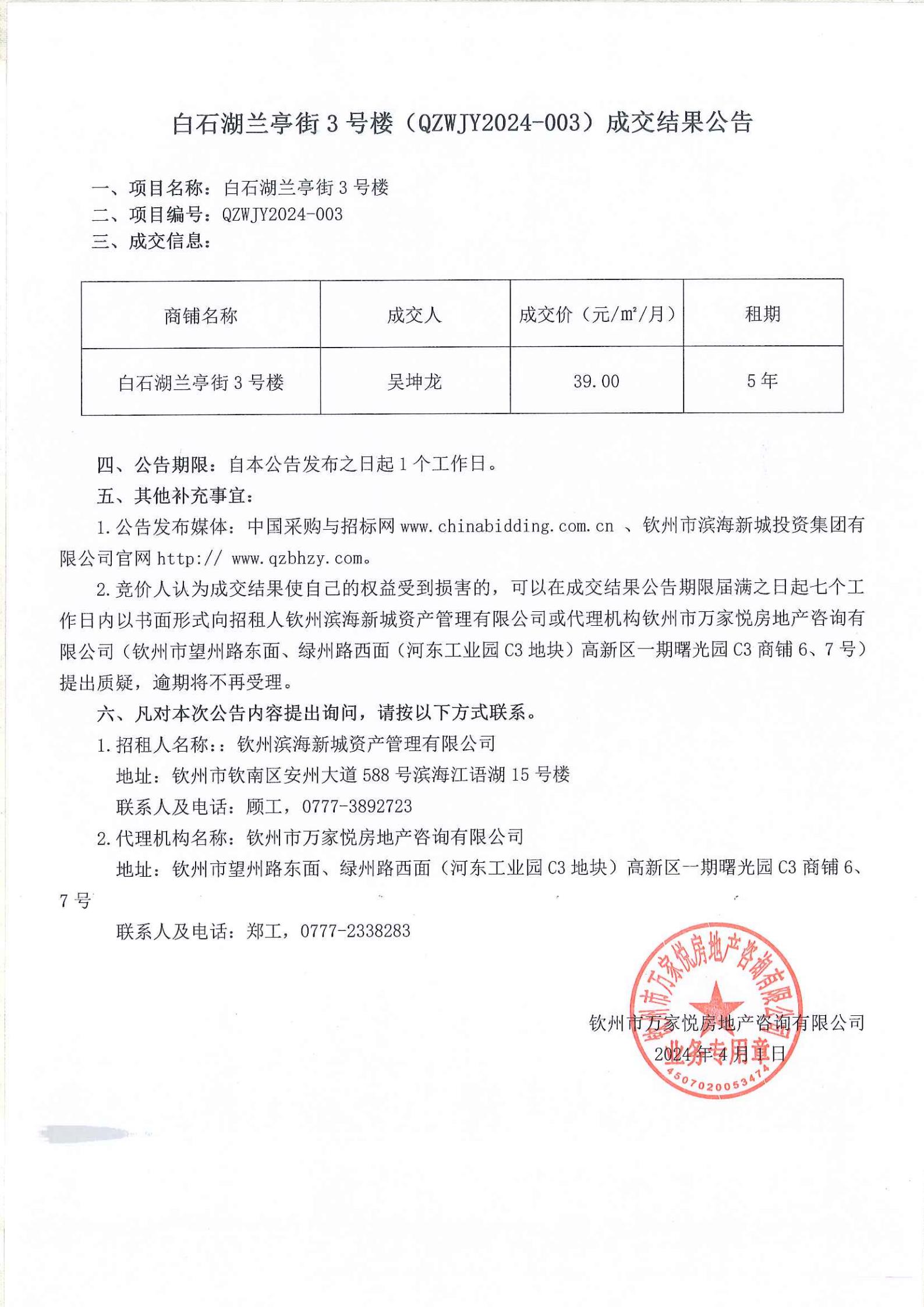 白石湖蘭亭街3號樓(QZWJY2024-003)成交結果公告
