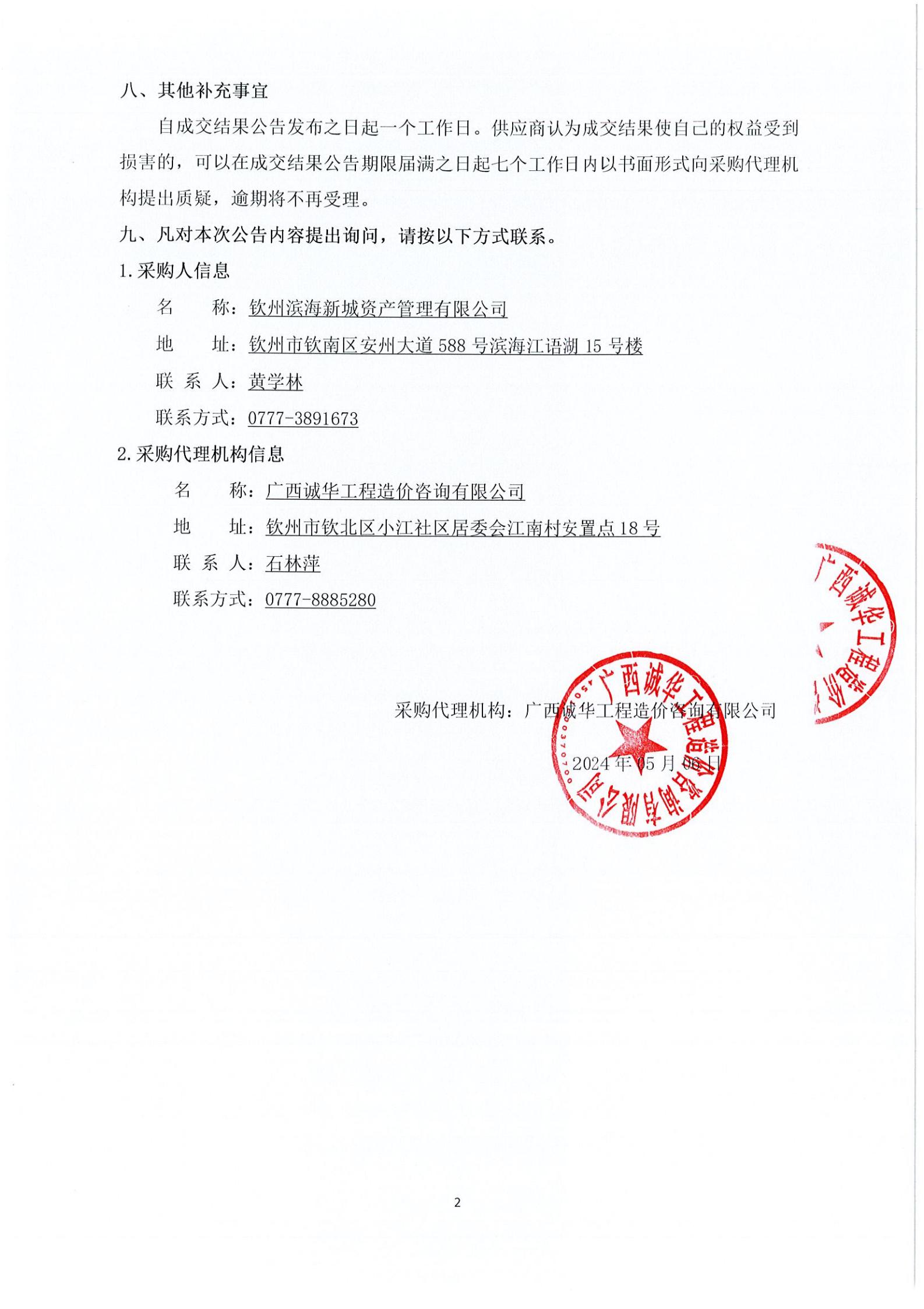 關于欽州市濱海新城投資集團有限公司綜合展示廳成交結果公告