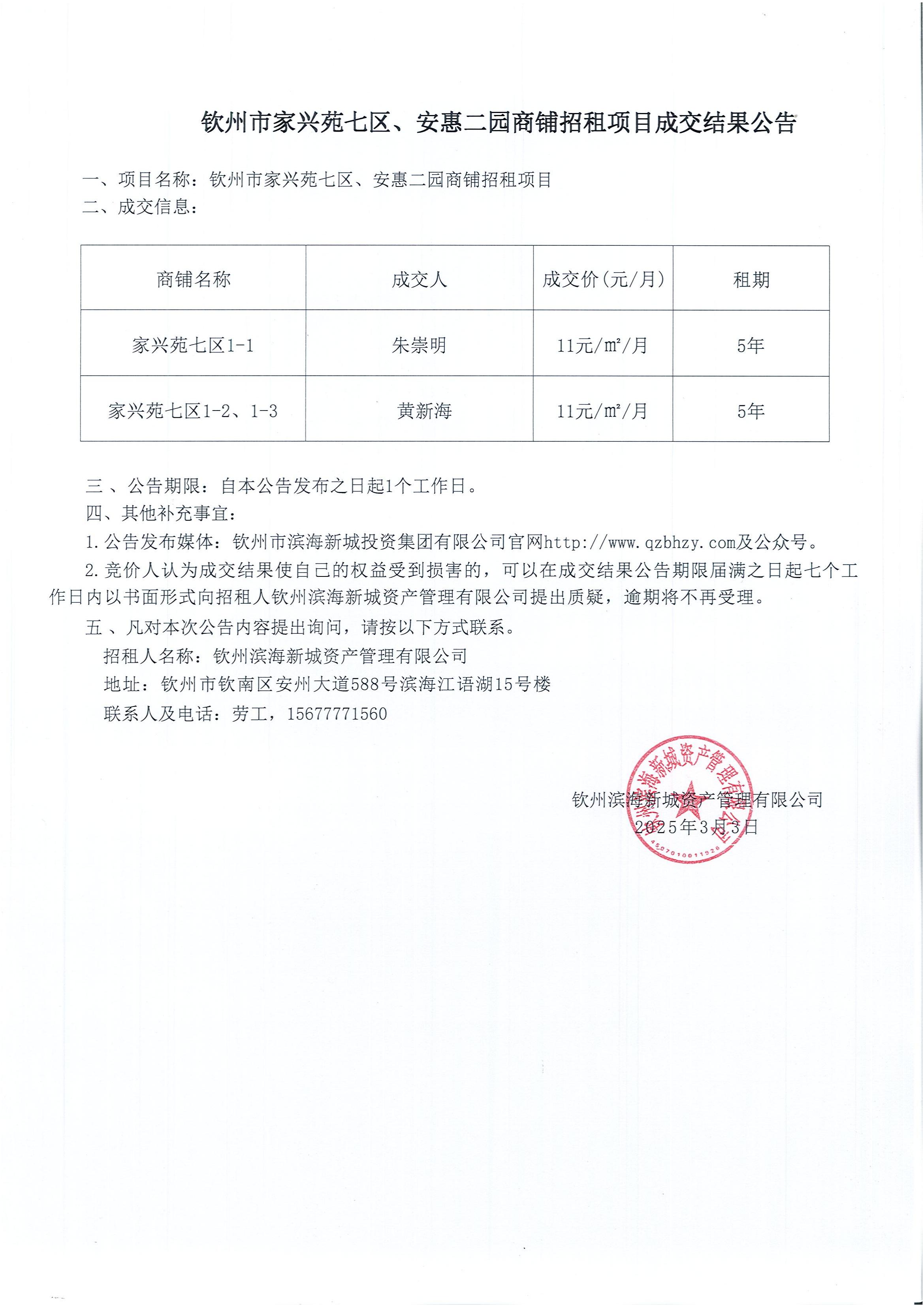 欽州市家興苑七區、安惠二園商鋪招租項目成交結果公告