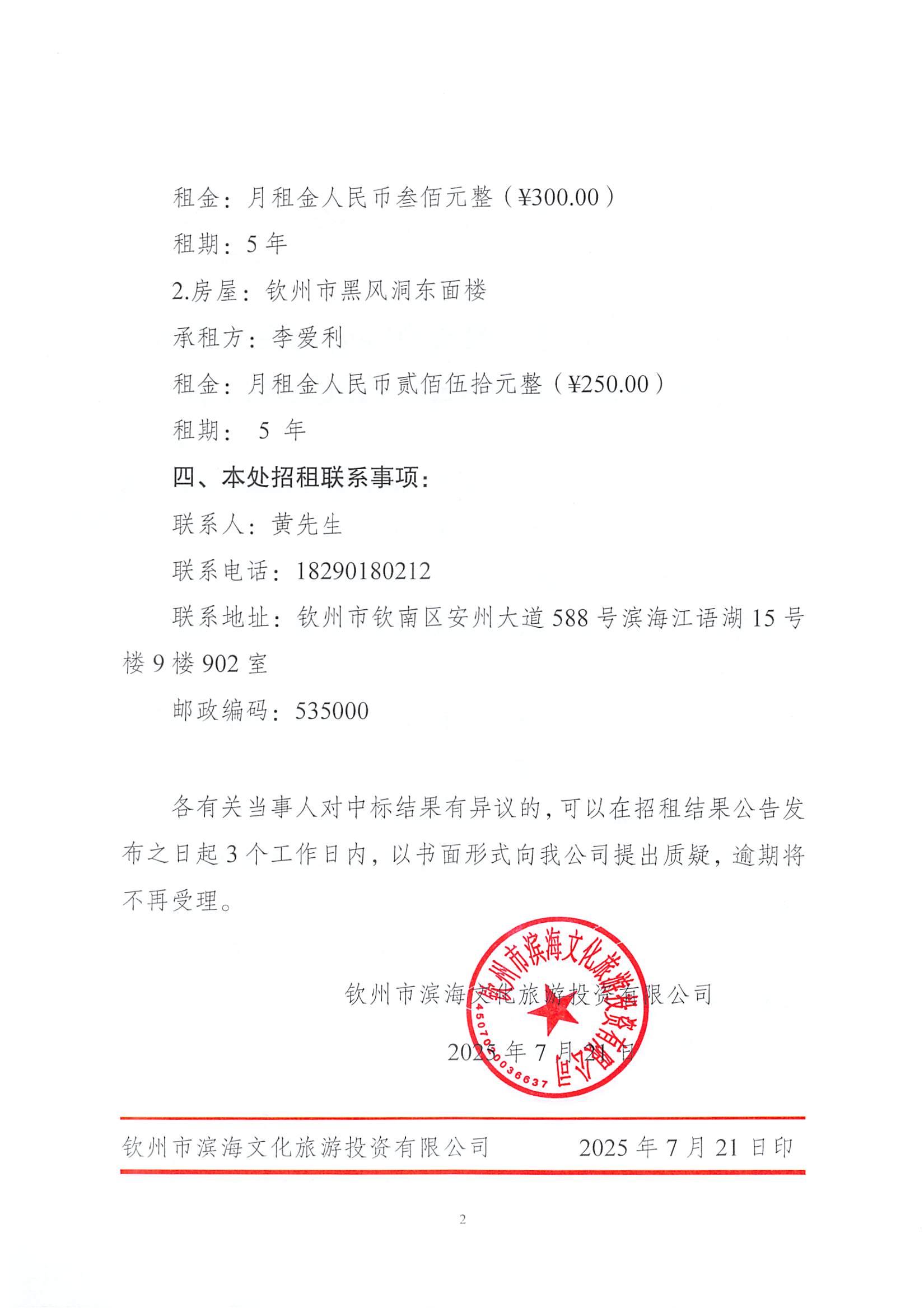 欽州市濱海文化旅游投資有限公司關于欽州市老街范圍2處房屋公開招租結果公示