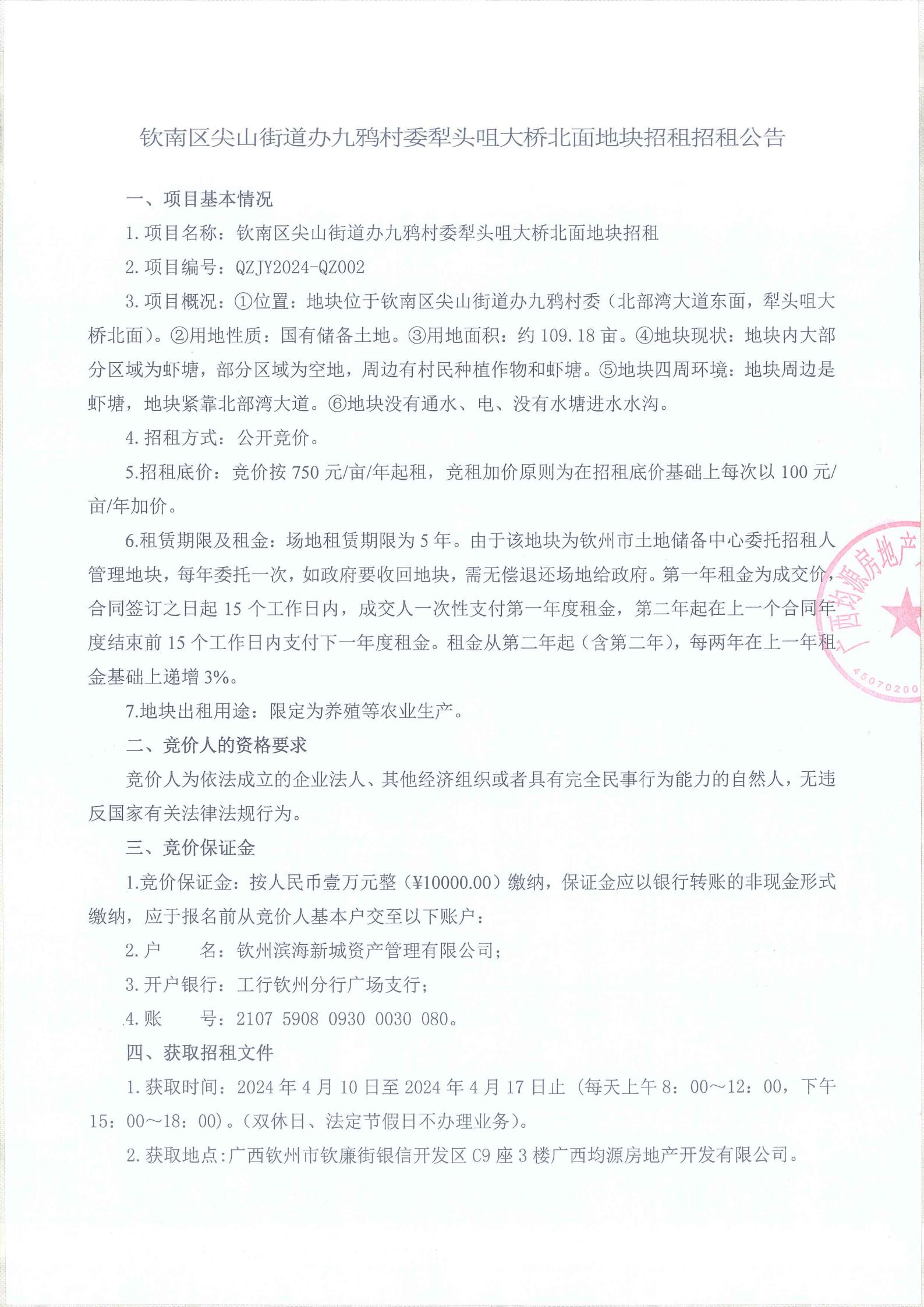 欽南區尖山街道辦九鴉村委犁頭咀大橋北面地塊招租