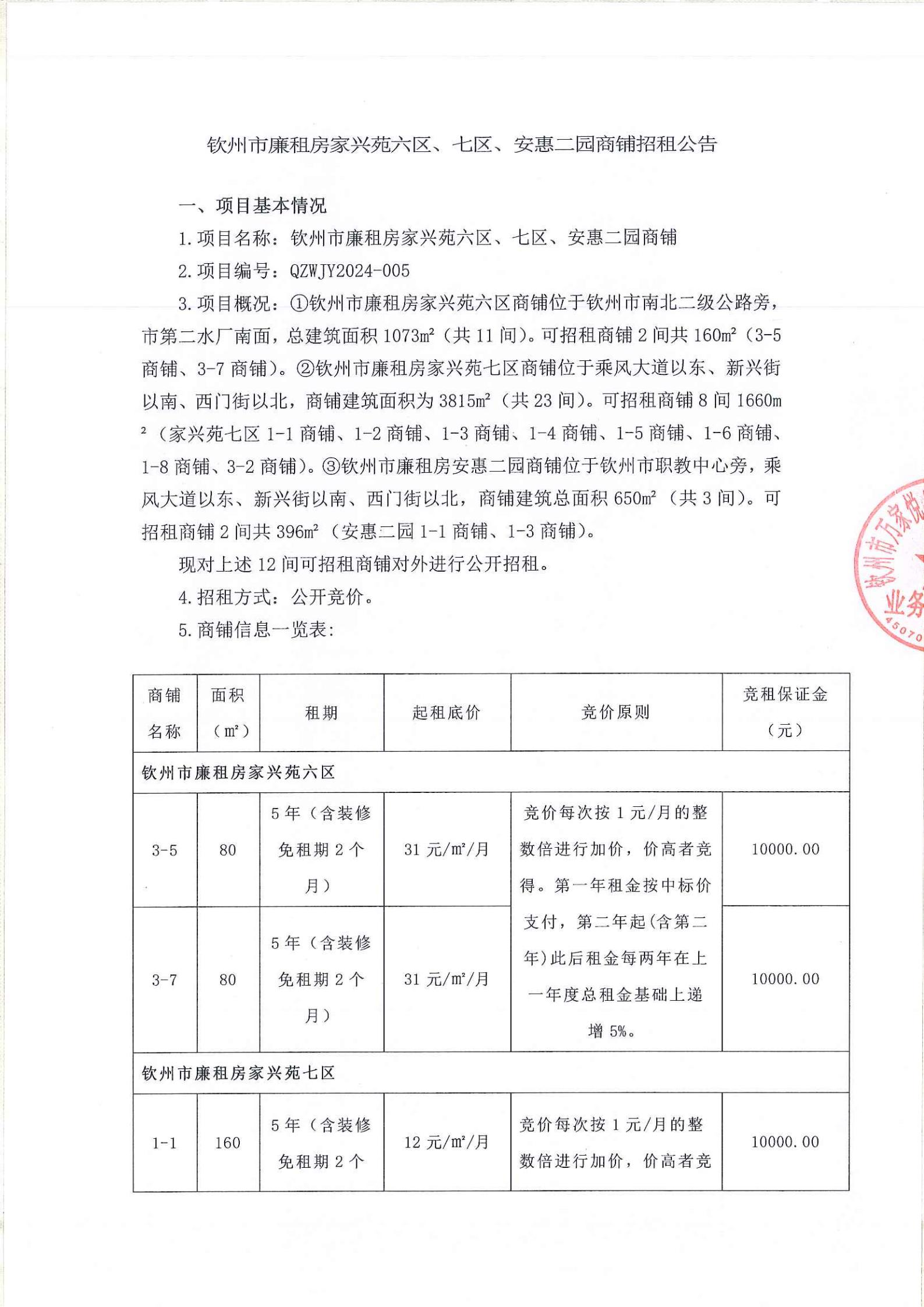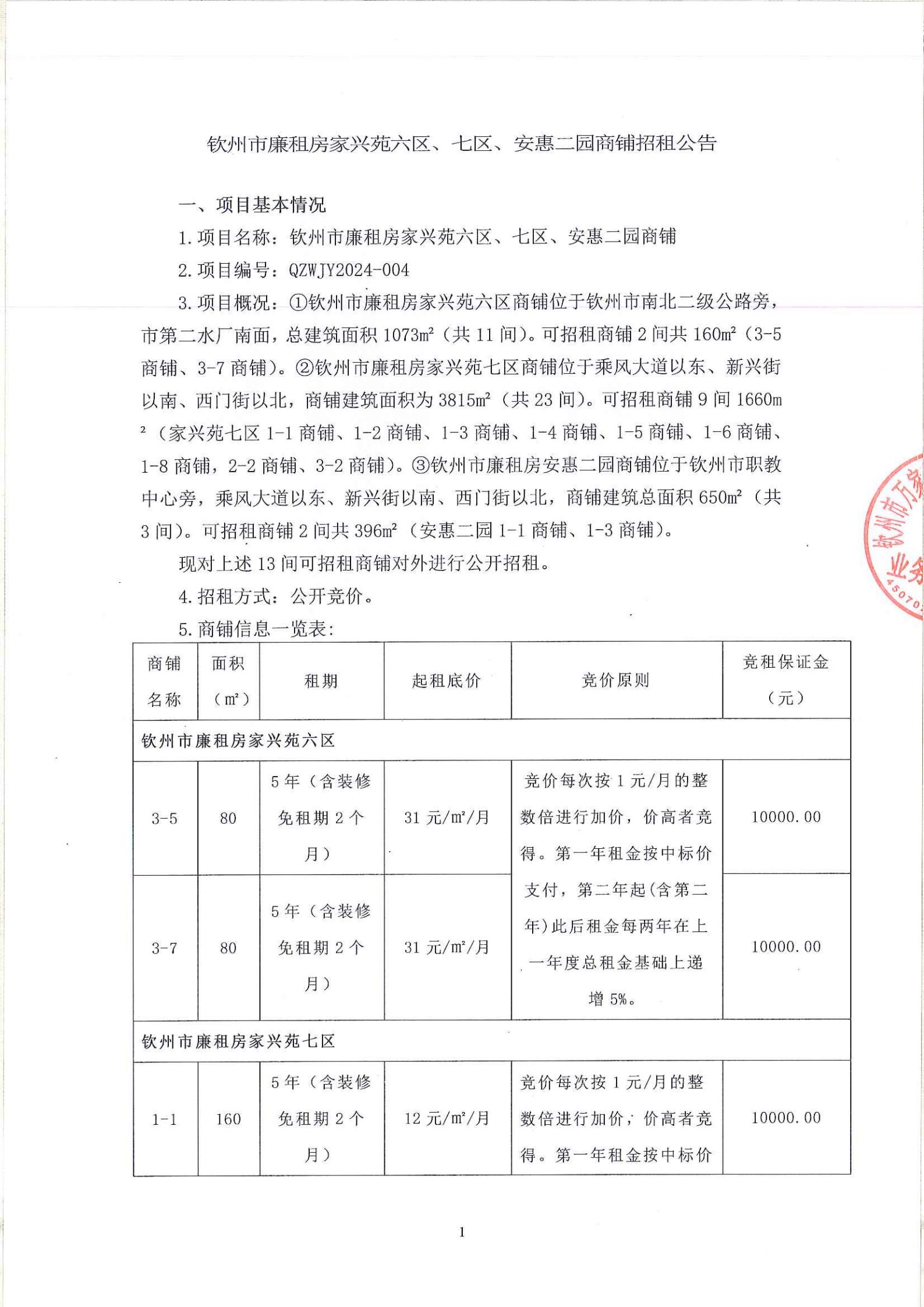 欽州市廉租房家興苑六區、七區、安惠二園商鋪招租公告
